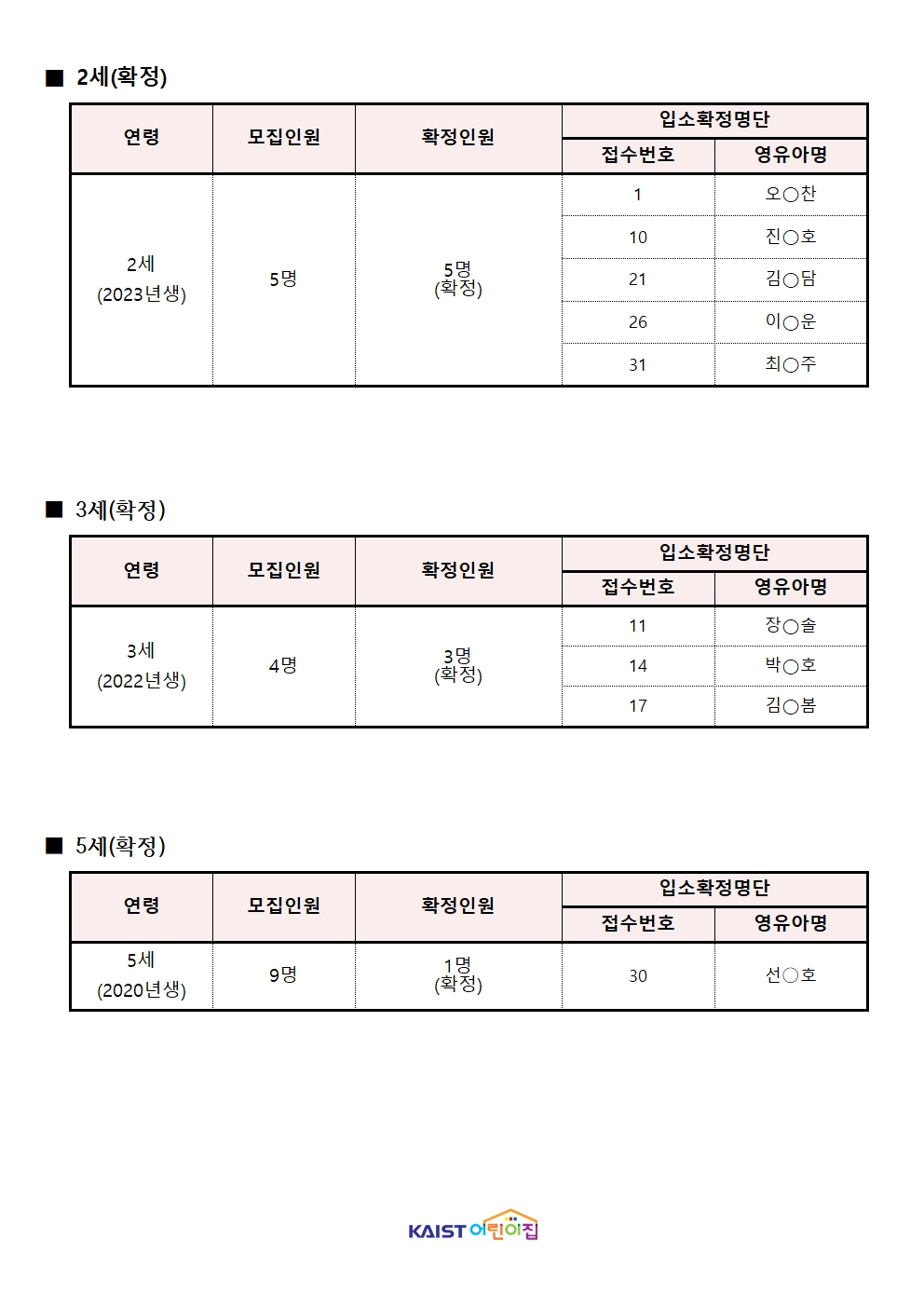 입소 확정된 명단과 확정 및 대기자 추첨 명단, 추첨 일정 등을 안내해드리오니, 아래의 내용을 확인해주세요.
